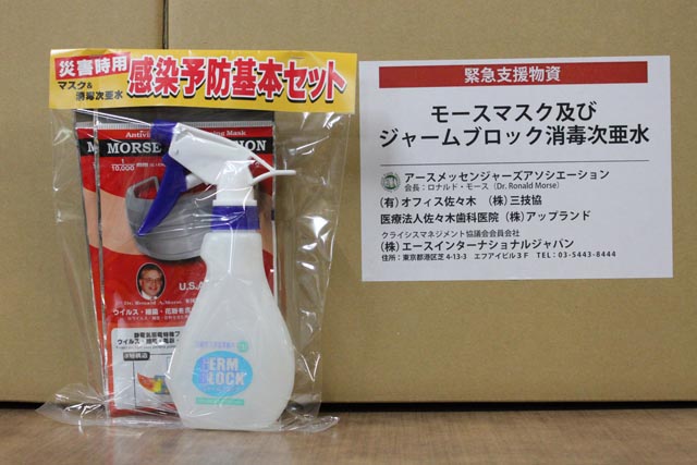 また、当協議会の幹事であり、救急専門医である、櫻井勝医師の被災地への医療支援の際にもモースプロテクションマスクとジャームブロック消毒次亜水の提供をエース社より受けている。